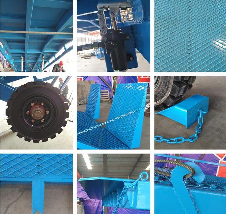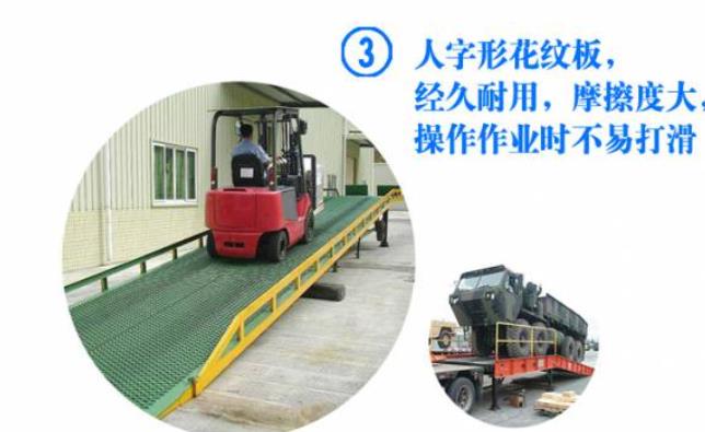 淄博登車橋-集裝箱登車橋-叉車搭橋-折疊式登車橋是與叉車配合使用的貨物裝卸輔助設備。有了它,叉車能直接從地面駛入汽車車廂內部進行批量裝缷作業(yè)。產品采用人工液壓動力,不需接動力電源,移動式登車橋坡面采用特制的高強度齒形鋼格板,具有的防滑性能,使叉車有更好的爬坡能力和操控性。即使在雨雪天,仍能保障正常作業(yè)。隨機配置的剎車墊,能有效防止叉車在登車橋上行走作業(yè)時,登車橋發(fā)生溜車及移動以保障作業(yè)安全。只需單人操作,即可實物的安全快速裝卸。